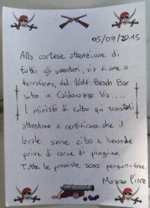 La memorabile giornata si è conclusa con il rilascio di un attestato informale, quanto vezzoso, che garantisce a pastacuriosi e fedeli, una cambusa pinguinfree, presso il Wolf Beach Bar.